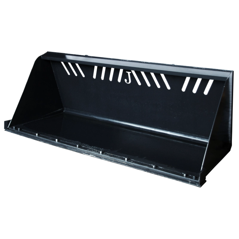 The Jenkins Iron & Steel High Volume Snow & Material Bucket is composed of 3/16″ steel with 5/16″ end caps making them ideal for anything from farm/home use to commercial snow removal applications. This bucket comes standard with ¾” by 8″ inch hardened reversible bolt-on cutting edges for easy replacement, significantly increased wear, and curb guard cutting edges to protect the sides of the buckets. All snow buckets also feature ¾” by 2 ¾” under strapping throughout the bottom of the bucket significantly increasing the rigidity and life of the bucket. The 9′ and 10′ buckets also come standard with removable bolt-in stabilizing bars which evens the cutting edge wear for those who push a lot of snow! Plasma cut screening allows for easy visibility of the cutting edge from the skid loader.